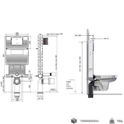 - Καζανάκι εντοιχισμού μονότουβλου τοίχου με πόδια στήριξης για κρεμαστές λεκάνες