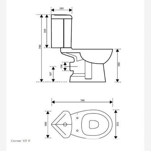 Γωνιακή Λεκάνη ΧΠ με πίσω ή κάτω σιφώνι και κάλυμμα πλαστικό Γωνιακό Kαζανάκι ΧΠ - Μηχ/σμός 2πλης ροής Διαστάσεις: 740 × 400 × 740 mm Χρώμα: Λευκό Πίσω Σιφώνι P: 180mm Κάτω Σιφώνι S: 190-220mm